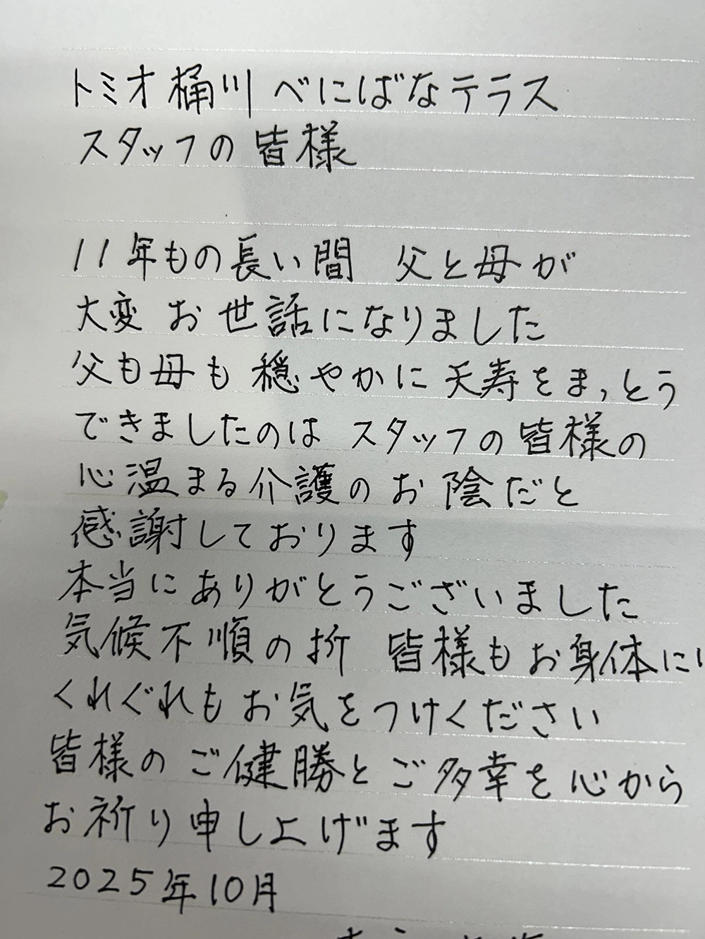 先日、ご家族様からお菓子を頂戴し、添えられていたお手紙を拝読いたしました。